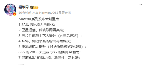 根据该博主的预测国尚策略,华为将在11月25日的Mate80系列发布会上还会重点讲述:5A级通讯能力再进化、卫星通信和低轨联网再突破、芯片性能与工艺大提升(五年后首次)、环环和侧边小孔的秘密与黑科技、电池续航大提升(14天探险模式超续航)、Mate870 RS的20GB大运存与Mate X7的端侧AI能力以及鸿蒙6.0.1的新功能、新特性、新玩法。